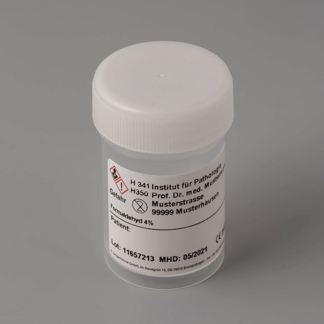 20 ml Probengefäß – ideal zur sicheren Fixierung und Aufbewahrung von Gewebeproben für histologische und dermatopathologische Untersuchungen. Stabil, dicht verschließbar und laborgeeignet. Optional mit oder ohne Formalin 4%. Bitte wählen Sie Ihre Variante.